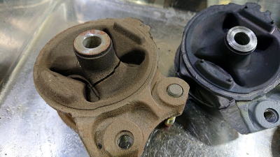作業時に脱着を行うエンジンサイドマウントは劣化でひび割れている場合には交換です。